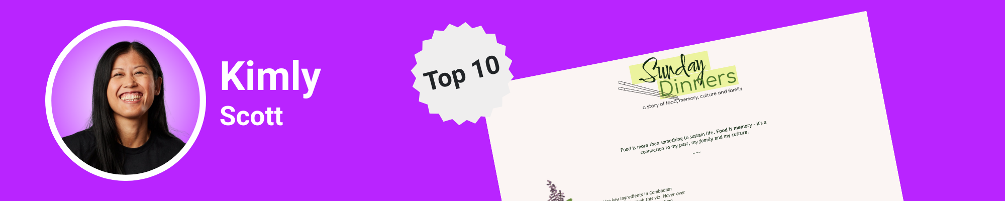 Kimly Scott is a three-time Tableau Visionary, Tableau Ambassador, and the creator of 19 Viz of the Days. Her Iron Viz submission, Sunday Dinners, explores the powerful link between food and memory through the lens of Cambodian cuisine.