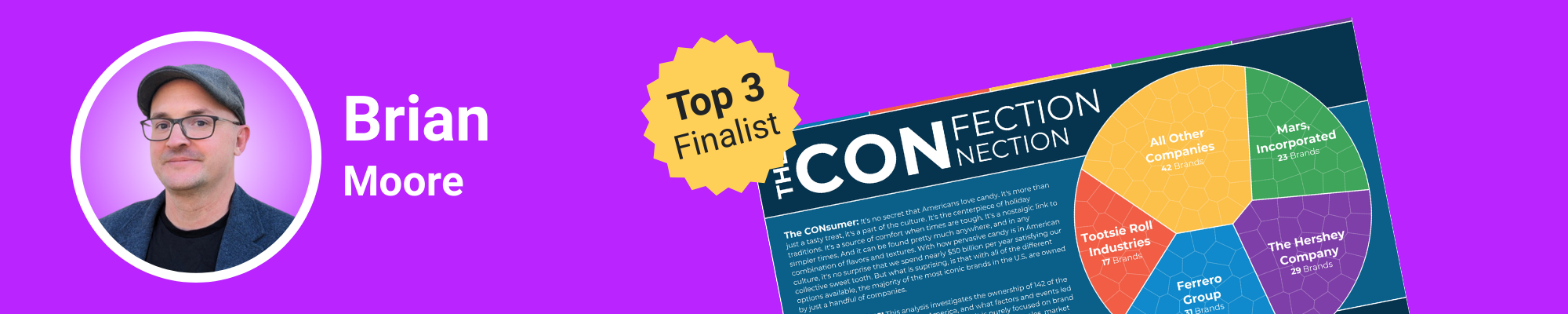 Brian Moore is a four-time Tableau Visionary, six-time Ambassador, and leads the Boston user group. His Iron Viz entry, The Confection Connection, traces candy brands through their complex acquisition chains - some switching hands eight or nine times.